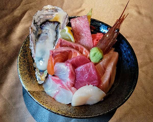 「魚紳頂上海鮮丼」採用最新鮮的旬味,包含牡丹蝦、生蠔、干貝、鮪魚、鮭魚、白旗魚、龍虎班、玉子燒,澎湃又豐盛,給的份量十足毫不手軟,視覺跟味覺都是一大享受,多項食材碰撞出燦爛的火花,是必點的招牌單品。