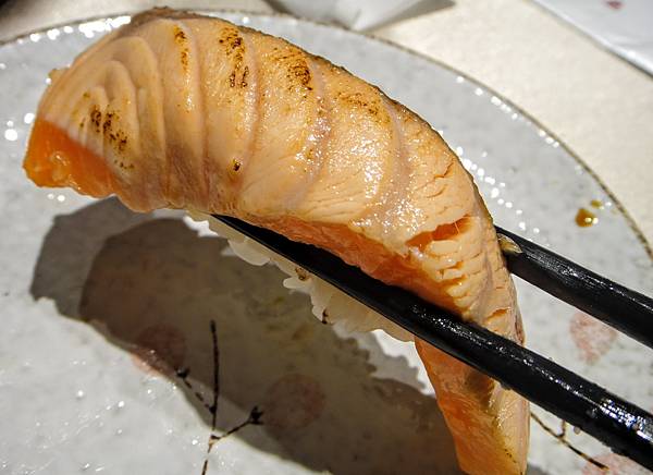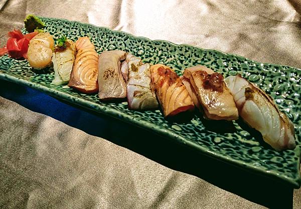 「盛合握壽司」共有八貫,由右而左分別是龍虎斑、白旗魚、鮭魚、龍虎斑、大目鮪、鮭魚肚、比目魚鰭邊肉、和干貝,團子有請師傅稍微炙燒,入口散發焦香氣息,將食材精華給牢牢鎖住,大海的絕美芬芳在唇齒間飄散,每次的咀嚼都是幸福體驗 。