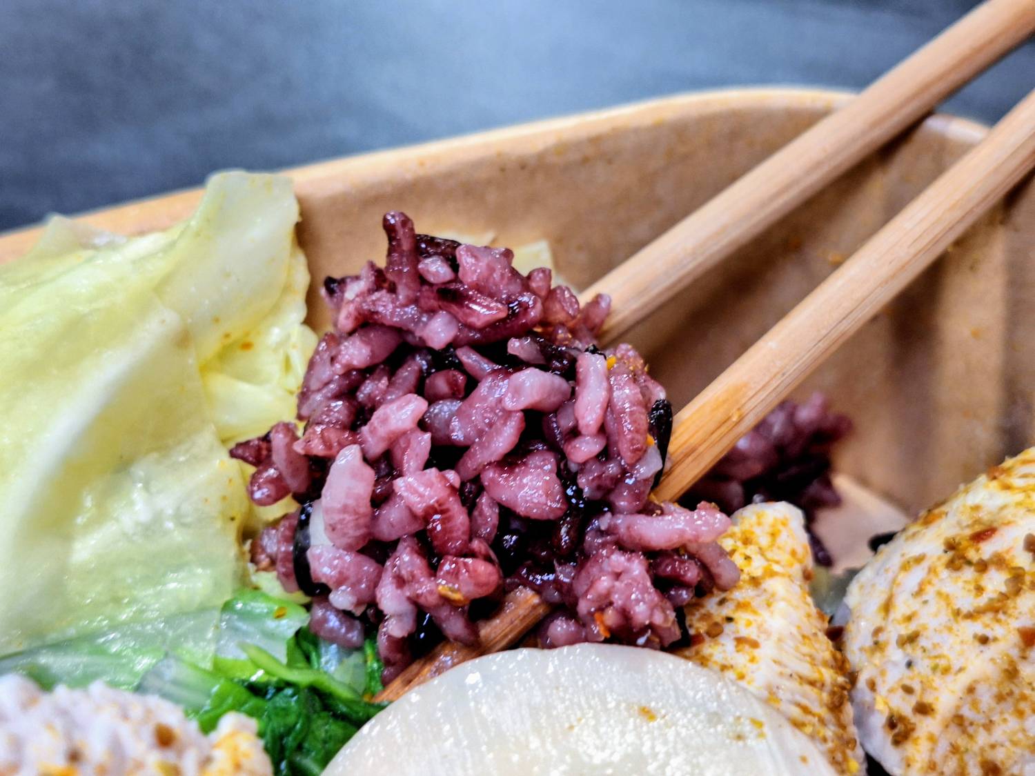 特別值得一提的是,店家米飯特別選用富含花青素的低GI黑糙米飯,與一般的紫米不同,因紫米是糯米較容易脹氣,而黑米則是糙米,吃起來口感扎實帶有嚼勁,且對身體會更加友善。