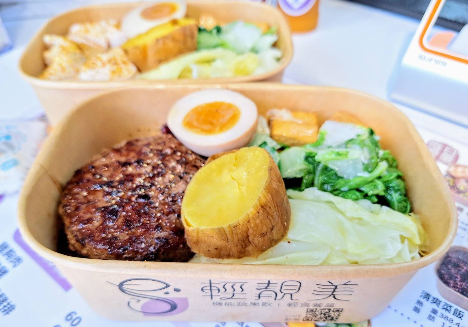 蔬果飲喝完,接下來就是主角登場「輕靚美」的健康餐盒,餐盒選用高成本環保牛皮紙餐盒及環保筷,不僅質感出眾,更兼顧衛生與永續理念!餐點遵循「蔬菜→蛋白質 (豆、蛋、魚、肉)→澱粉 (地瓜、黑米飯)」的進食順序而設計,有雞胸、豬肉、牛肉、魚類等多樣主菜,配菜也非常豐富,當天有冰烤地瓜、溏心蛋、豆干、高麗菜、小白菜,溏心蛋的蛋黃很滑嫩,帶點醬香味,超級好吃,台農57號的冰烤地瓜甜香濃郁,口感綿密香甜,營養色彩通通到位!
