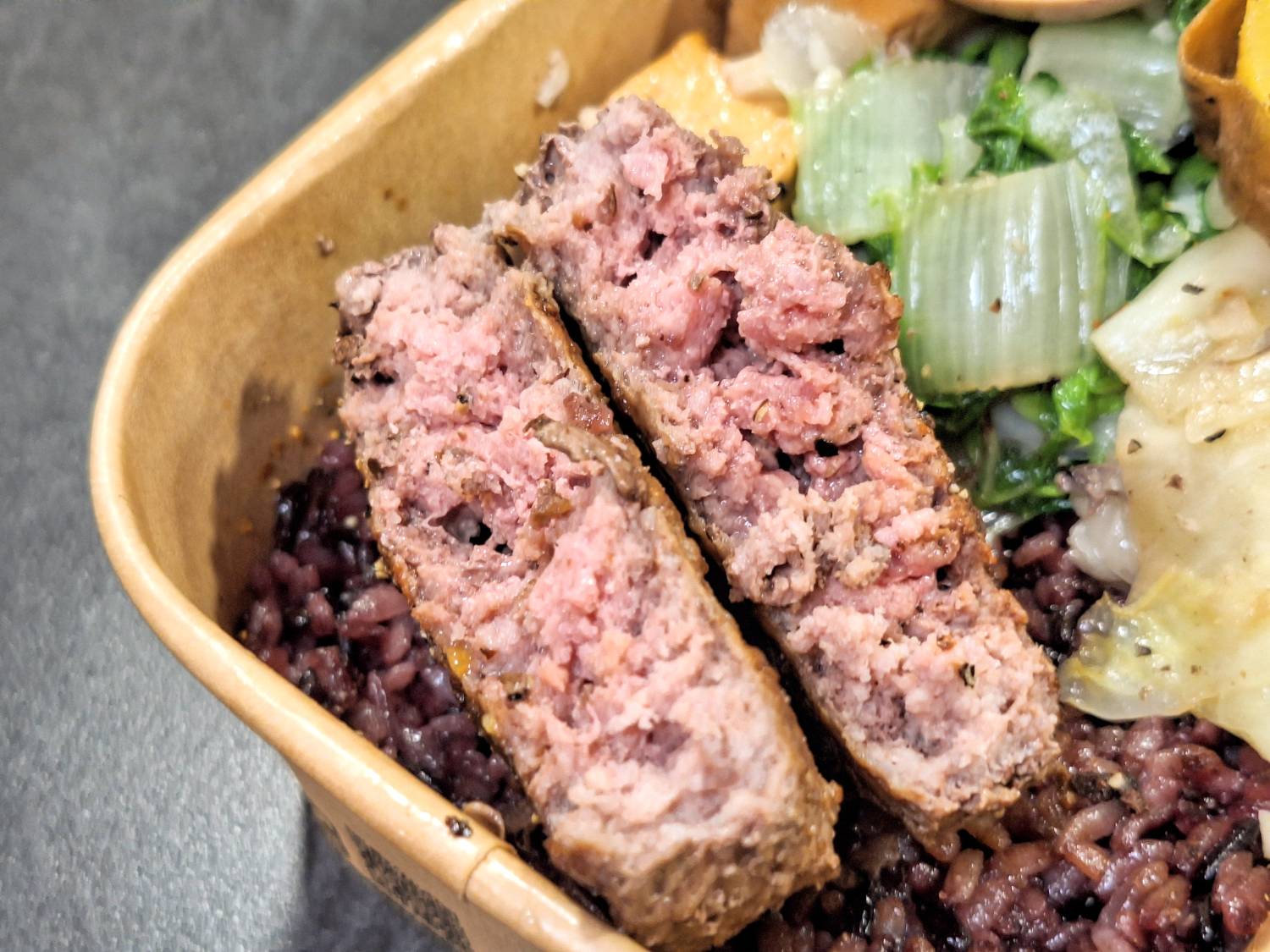 「牛漢堡排餐盒」選用澳洲穀飼牛肉,是百分百原塊肉手工捶打,不是重組肉,可以在漢堡排中看到自然的肉紋與粗纖維感,吃起來是有嚼勁、富彈性的真材實料。經過主廚長時間烘烤,外層略帶微酥、內層保持多汁狀態。調味上則是簡單地撒上玫瑰鹽,因為玫瑰鹽本身就能提出牛肉的鮮甜,而不會掩蓋肉香。整塊漢堡排吃起來真的有驚喜感,每一口都有牛肉香氣在嘴裡綻放,讓我忍不住一口接一口。
