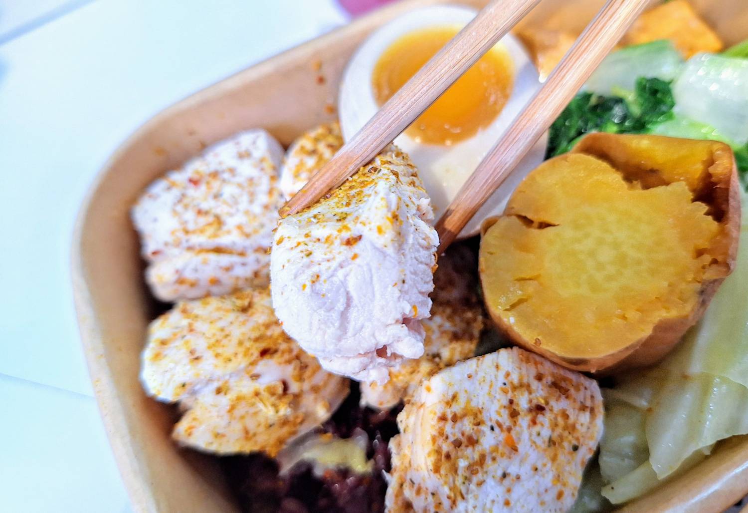 「主廚雞胸餐盒」選用的是國產雞胸肉,經過控溫控時的水煮方式烹調,這技術可不是普通水煮,透過低溫慢煮精準掌握時間,讓雞胸肉不會流失水分,吃起來口感超級Q彈,還有肉汁鎖在裡頭,每一口都鮮嫩多汁!主廚沒有重鹹調味,而是撒上自家調配的草本調味粉,裡頭有葫蘆巴籽、時蘿籽、紅辣椒、大蒜、月桂葉等成分,聞起來有淡淡的辛香草香氣,吃起來不會太重口味,反而提升了雞肉本身的香甜,尾韻還多一點層次感,調味真的很利害,讓人不會膩,還越吃越喜歡。