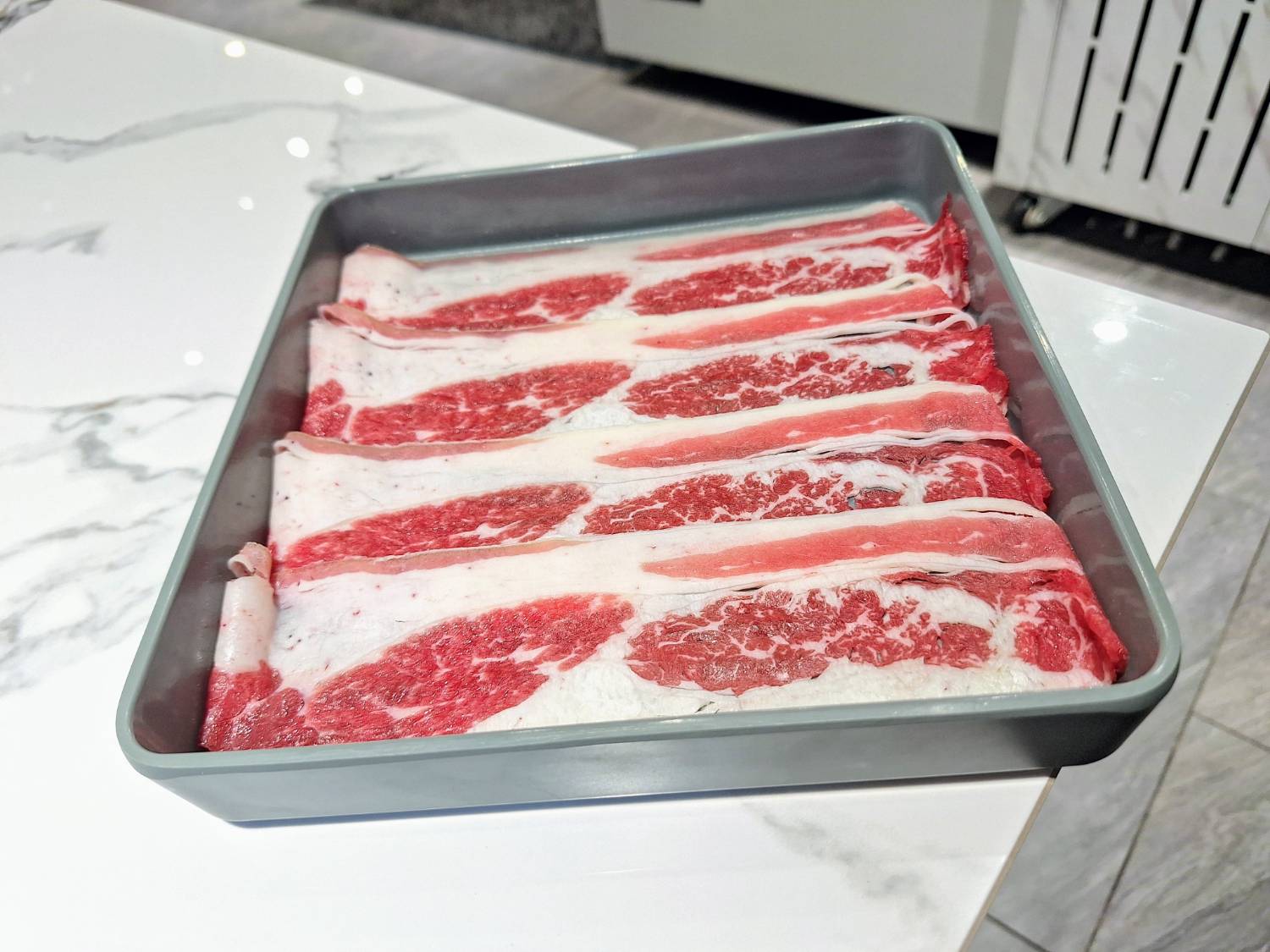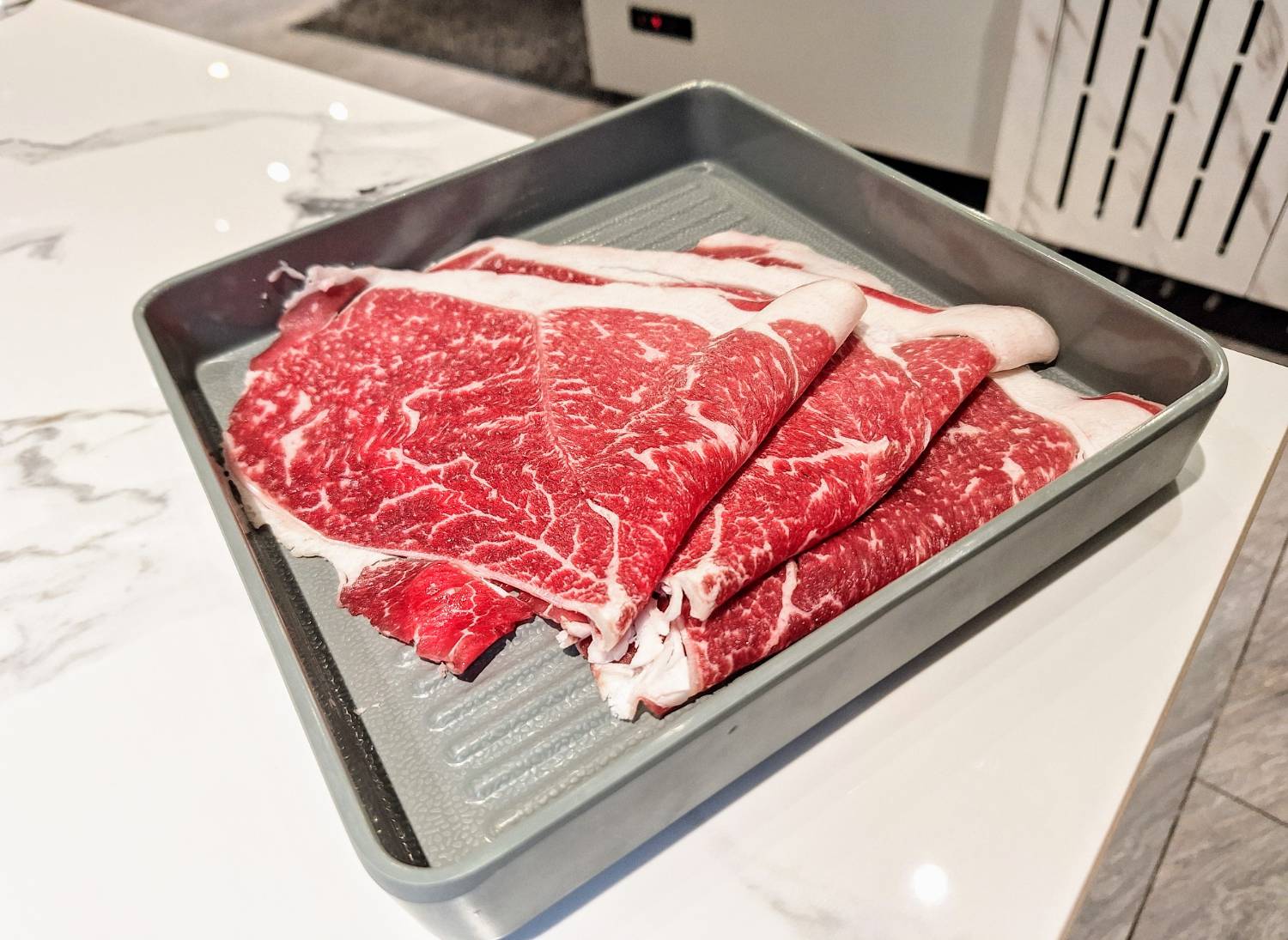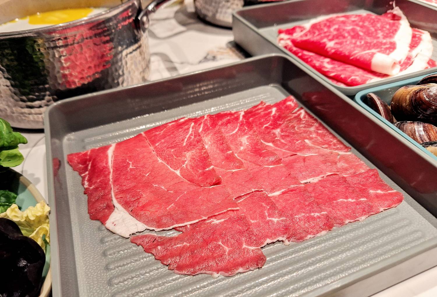 「澳洲和牛M6~M9」油花分布細緻均勻,色澤紅嫩又帶光澤,一下鍋涮個幾秒就能入口,肉質柔嫩帶有明顯香氣及彈性,吃起來完全不乾柴,我們也續了不少盤。