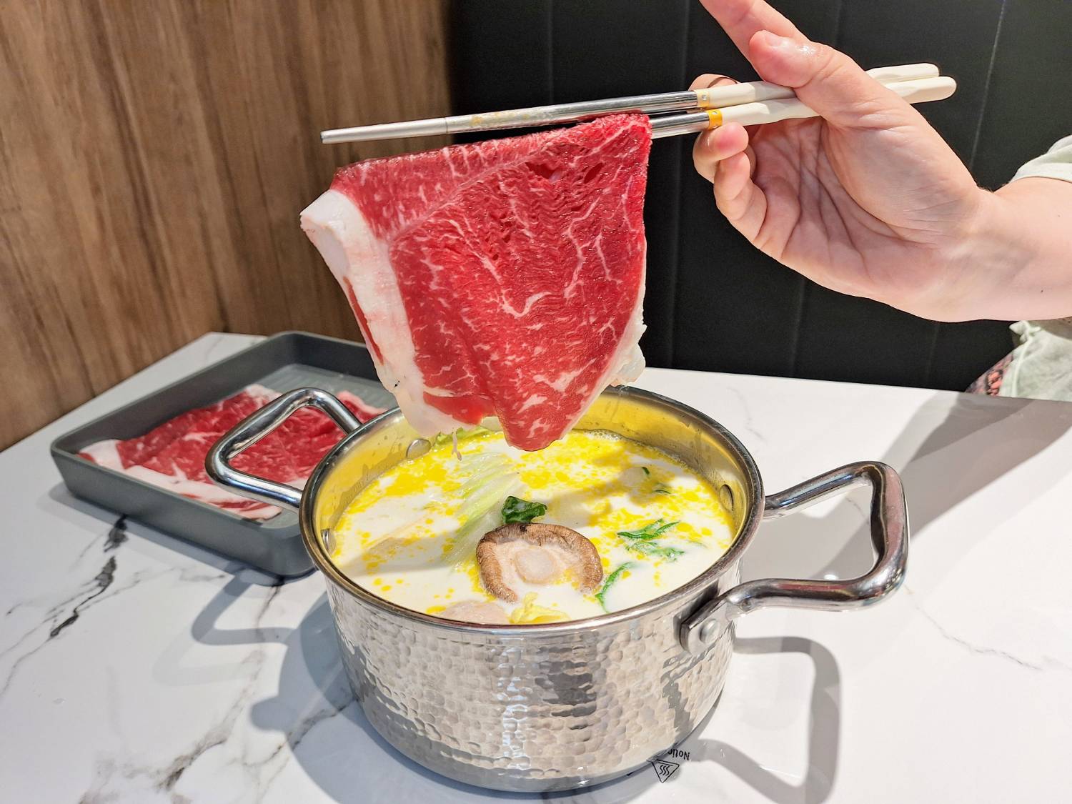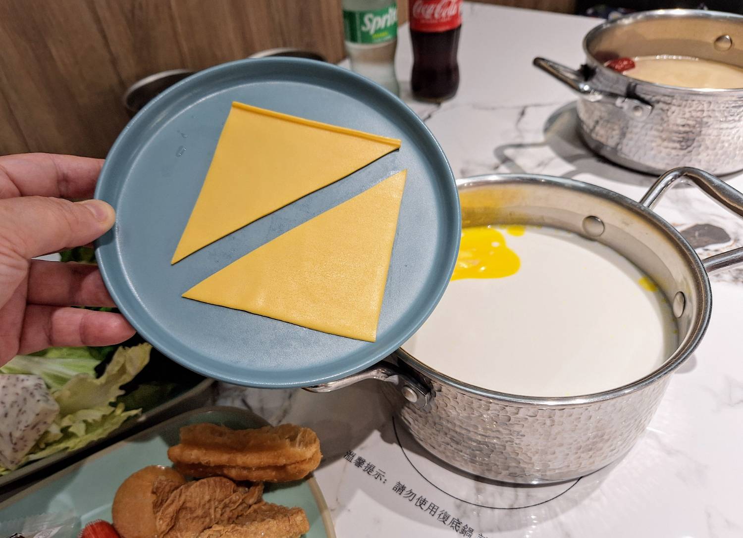 「起士牛奶」一上桌就飄出濃濃奶香,乳白色的湯底中帶著淡淡起司鹹香,還附有一片起司,湯頭入口潤順而不膩,喝起來奶香十足,煮蔬菜超搭,像是再吃奶油燉菜的口感。