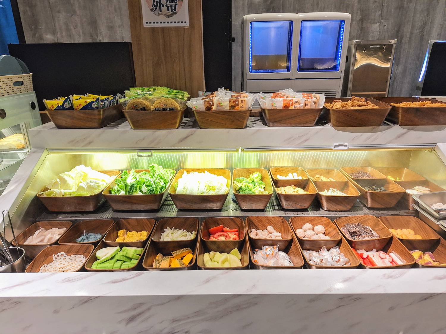 「金大鋤mini鍋物吃到飽-藝文店」蔬菜、火鍋料、附餐、飲料、甜點、冰淇淋採用自助吧型式,蔬菜和火鍋料會一格一格的整齊排放在箱子內,顯得特別的乾淨又衛生,肉品則為現點現切。