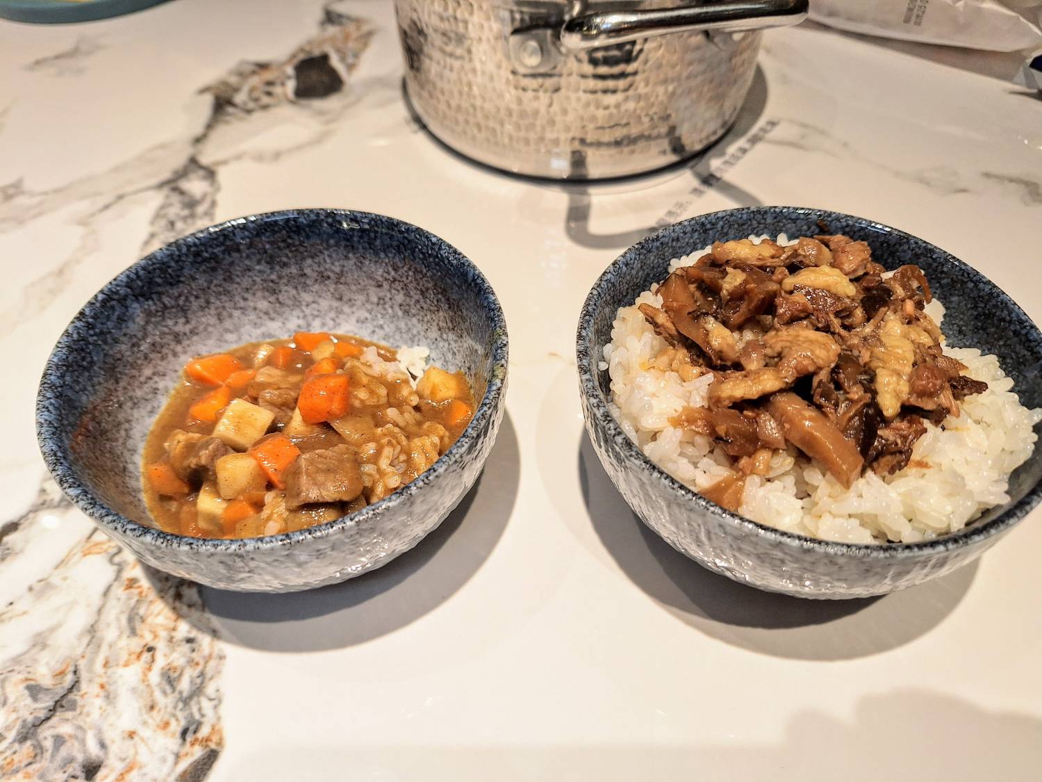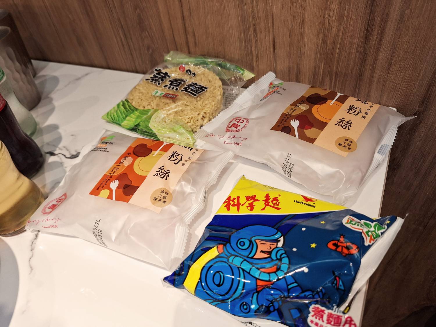 副餐包含白飯、蒸煮麵、粉絲、科學麵,還有金鋒滷肉飯及日式牛肉咖喱飯,讓你吃得飽足又滿足。