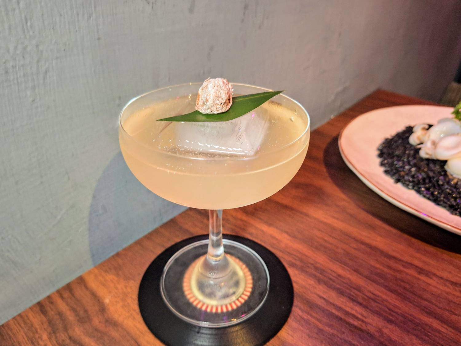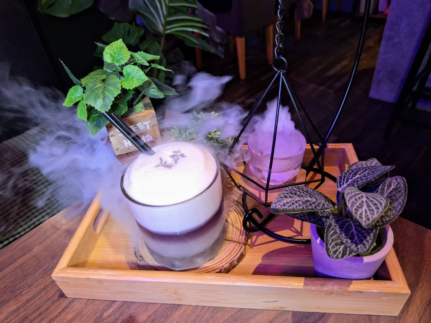 呈現紫色漸層的「移花接骨木」, 還使用乾冰製造出煙霧,擺置得超有氛圍,如同來到秘密花園。這杯調酒基底使用櫻花琴酒搭配香艾酒、接骨木花與蝶豆花,再加入檸檬汁與蛋白調合,上層奶泡綿密細緻,喝起來清爽微甜,又帶有一絲微微花香,從視覺、嗅覺到味覺層層堆疊,療癒又夢幻。