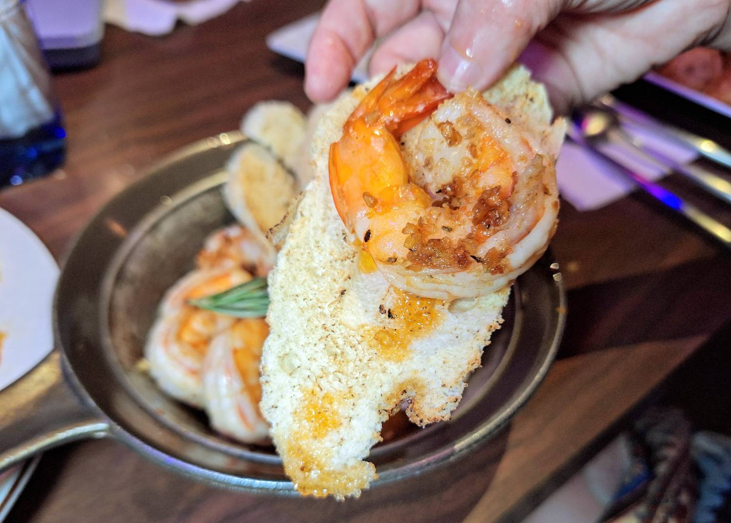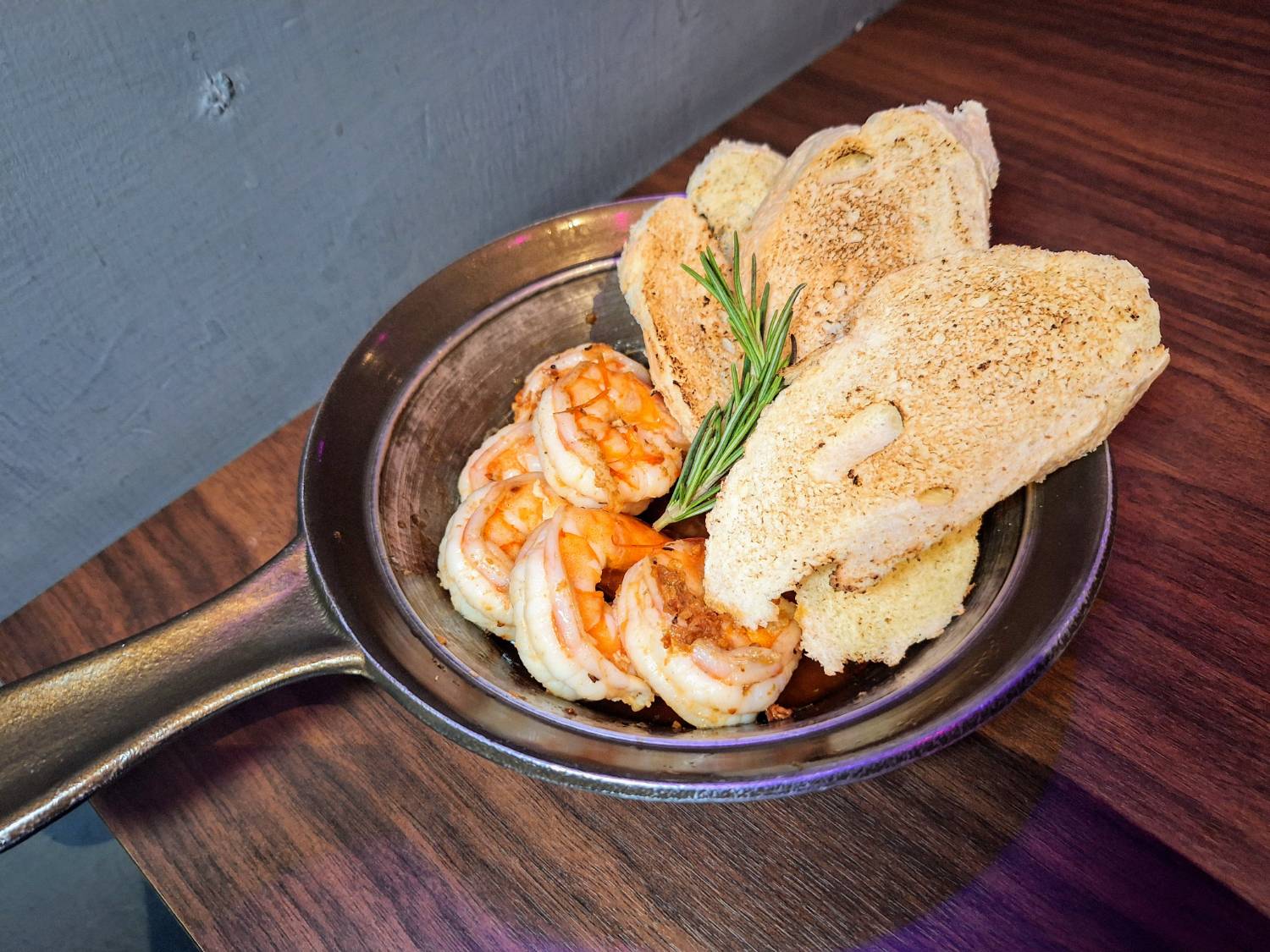 「油封蝦佐麵包」選用新鮮大蝦,而且貼心去殼方便入口,加入大蒜與多種香草調味以橄欖油低溫慢煮,蝦子入口後很有彈性帶著淡淡蒜香,香酥的法式麵包可沾上橄欖油一起吃,口感絕佳,友人讚不絕口!
