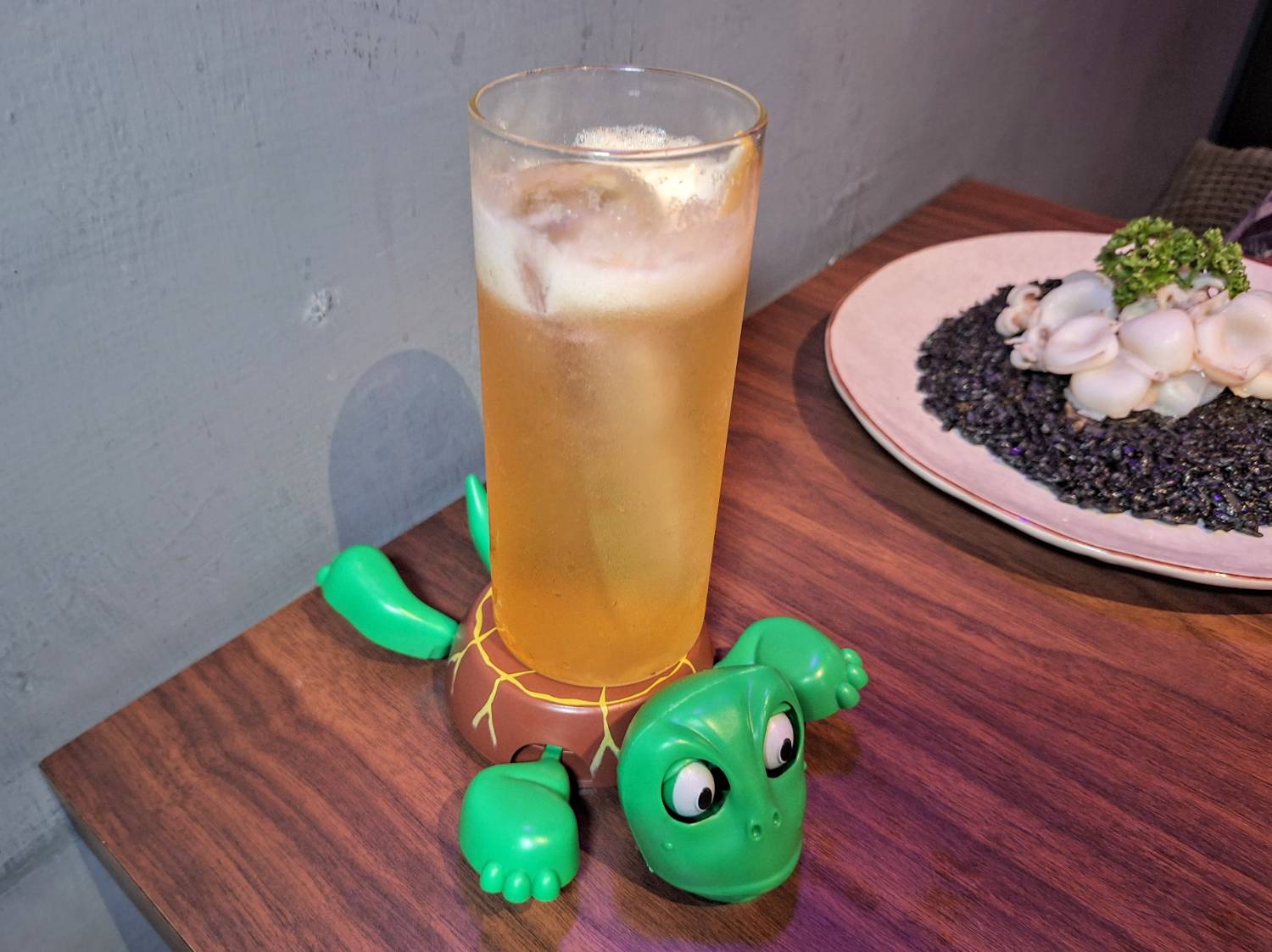 「烏桂烏桂翹」擺盤造型吸睛可愛,是一隻會叫的烏龜,使用自釀烏龍琴酒為基底,加入桂花釀與新鮮檸檬汁調和,再注入冰涼的通寧水,入口帶著淡淡的桂花香,酸甜清爽會回甘。