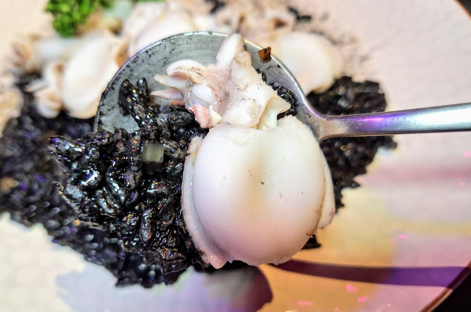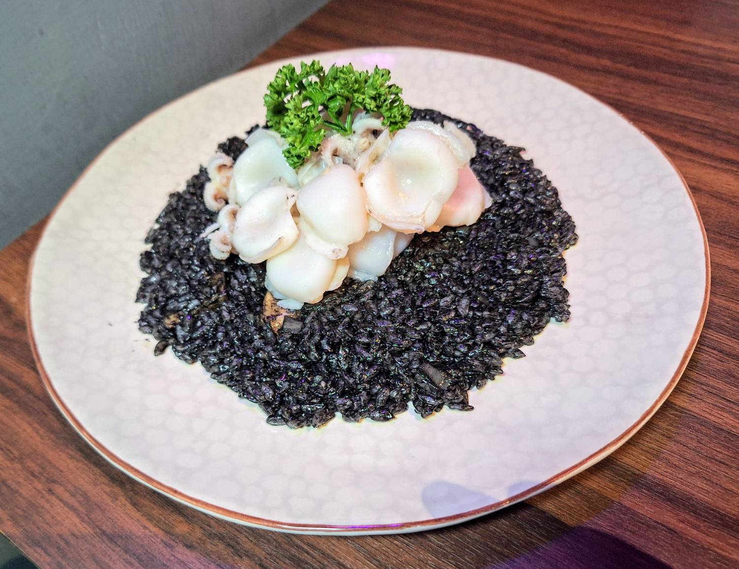 「深海黑珍珠燉飯」濃郁墨魚汁將米粒染上深邃黑色,燉飯收汁完美,每一口都吸飽了海洋鮮味,上層鋪滿新鮮小章魚,口感鮮嫩彈牙,與墨魚飯的鹹香完美結合,吃得到海味最誘人的風味。