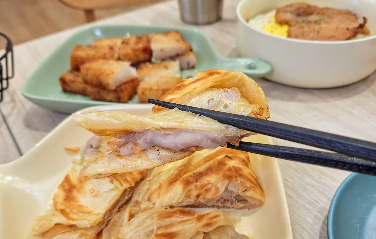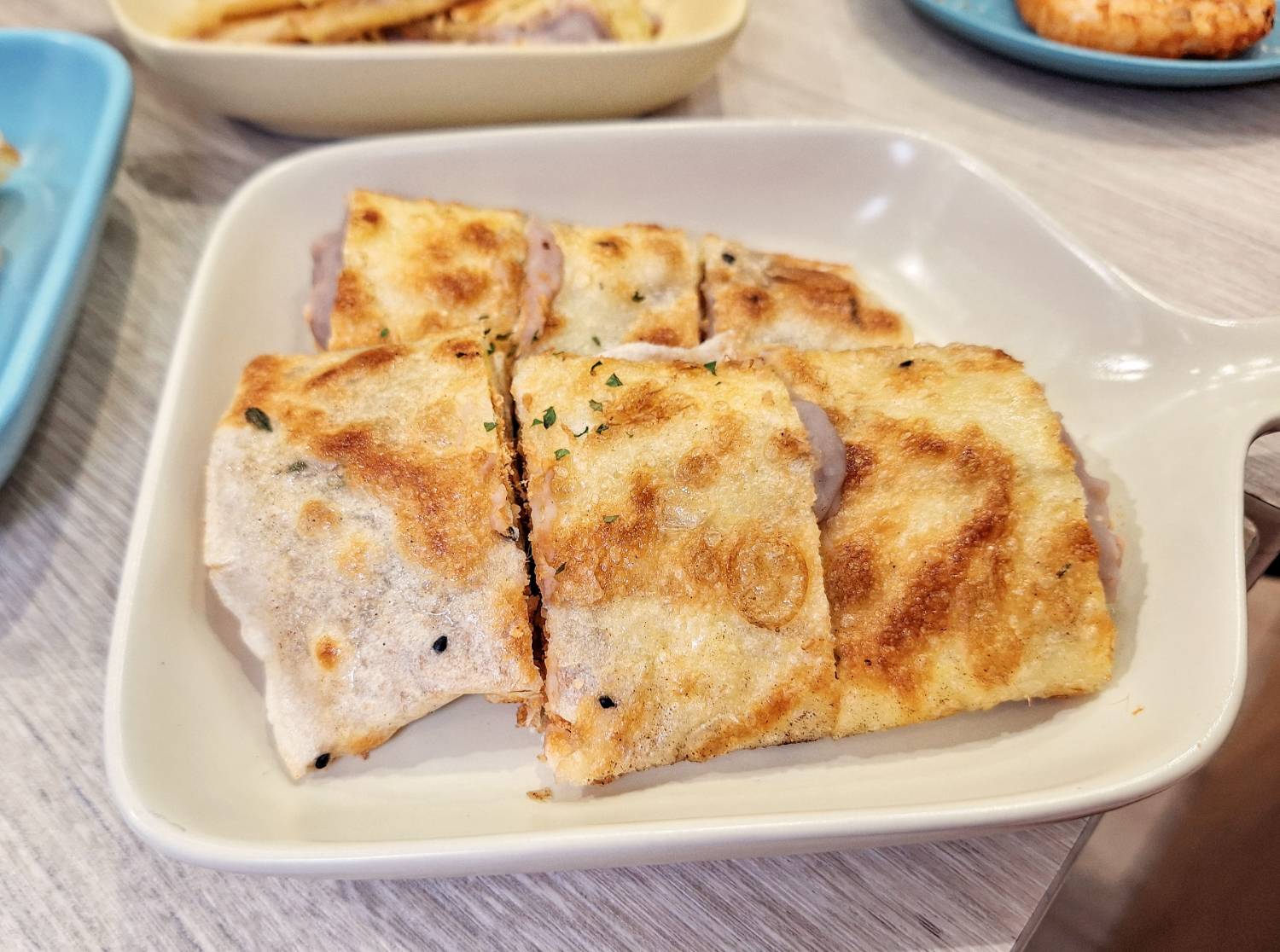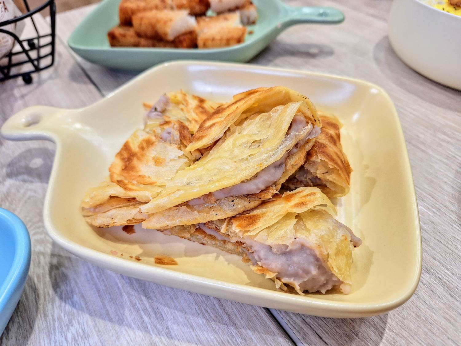 「芋泥地瓜抓餅」地瓜抓餅層層分明,一口咬下去卡滋卡滋的,配上手工製作芋泥,直接吃得到食材的自然香氣與細緻口感,絕對是點心類裡的驚喜單品。