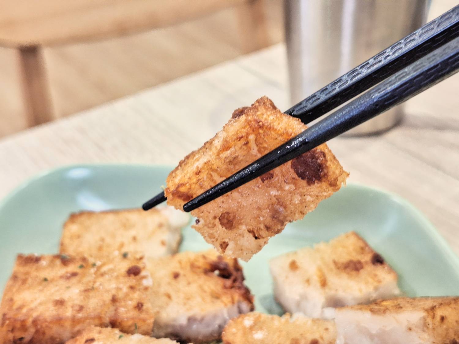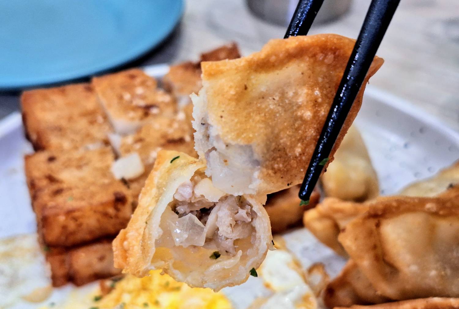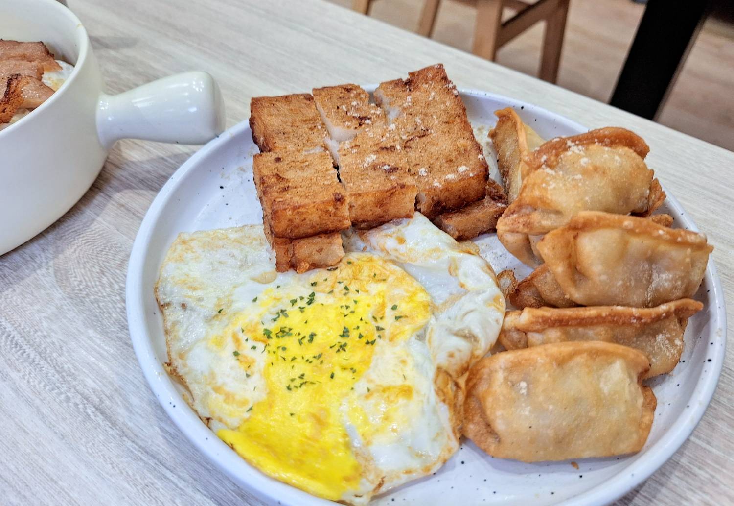「古早味三寶套餐」包含煎餃、蘿蔔糕與蛋。煎餃炸到金黃香酥,裡頭的餡料保有鮮甜肉汁;蘿蔔糕同樣炸到外層酥脆,咬下去散發淡淡的米香和蘿蔔清香,很讓我們驚喜;再加上煎得恰到好處的的煎蛋,整體組合簡單卻份量十足,可以吃到最令人滿足的幸福味道。