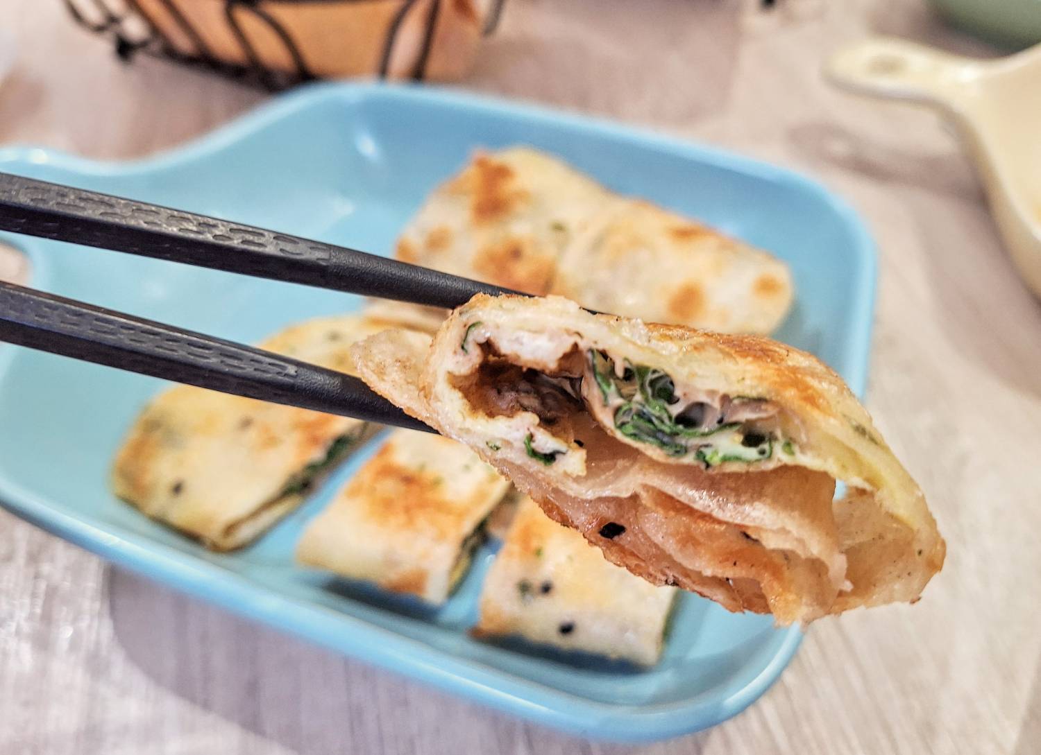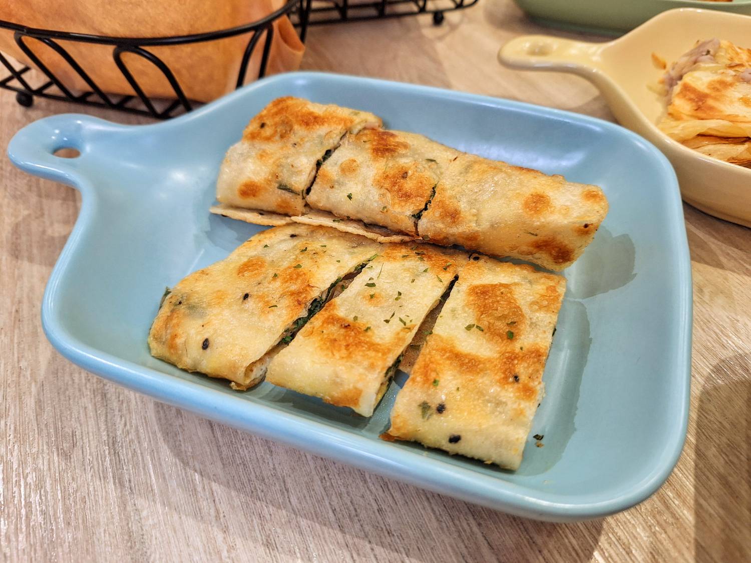 「九層塔蛋餅」九層塔的清香不會過於搶戲,反而襯托出蛋香與餅皮的酥脆感,一吃就上癮。