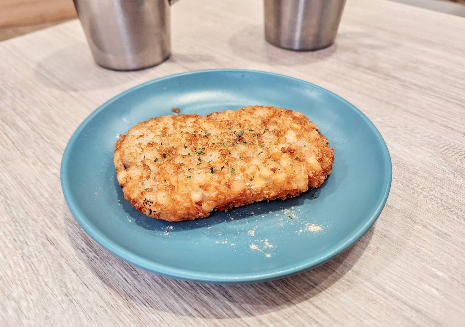 「金黄薯餅」外層炸得酥酥脆脆,金黃色澤光看就讓人食慾大開,咬下去外脆內鬆軟,馬鈴薯泥在口中化開時帶著淡淡奶香與甜味,怎麼吃都不會膩。