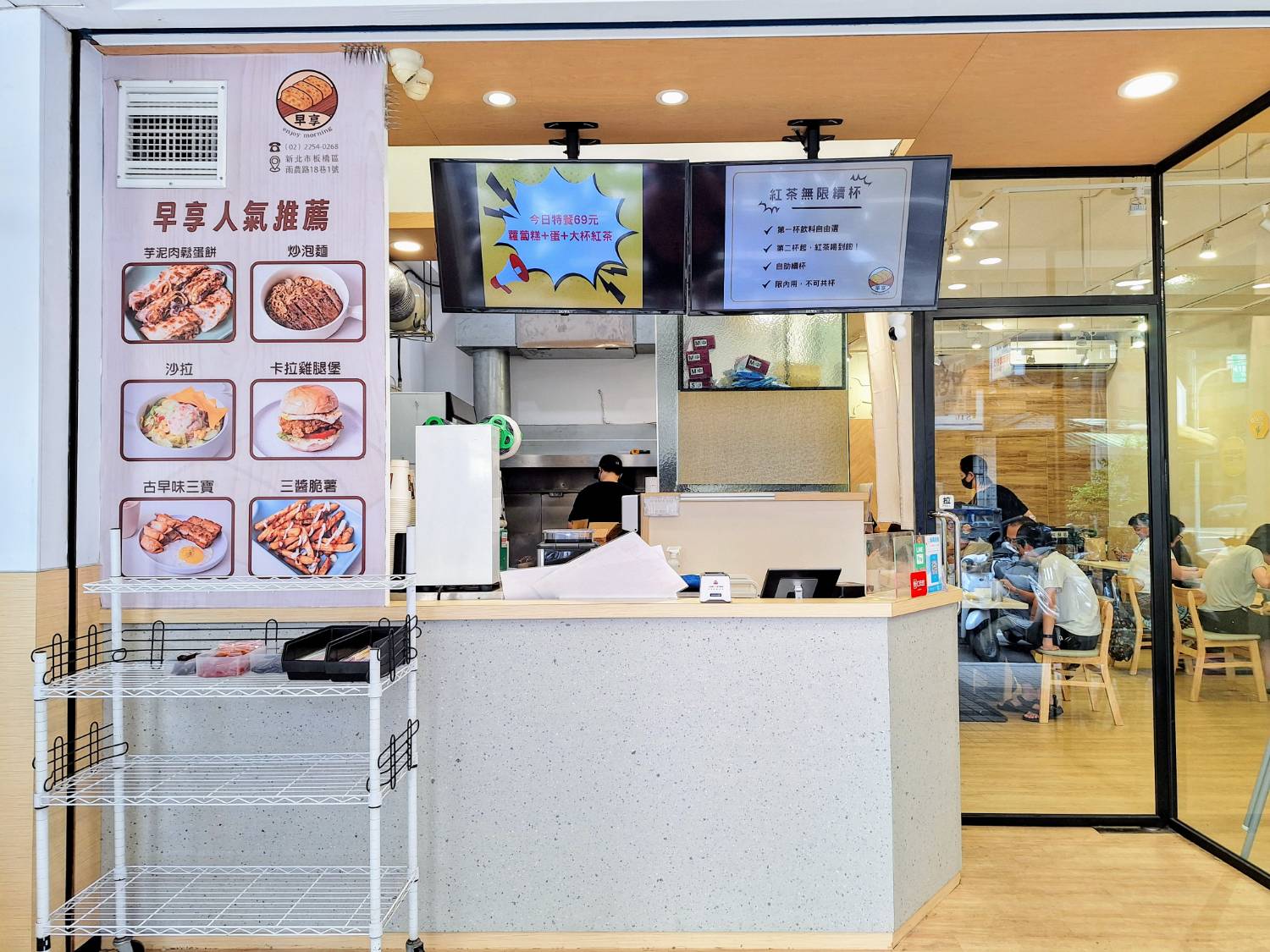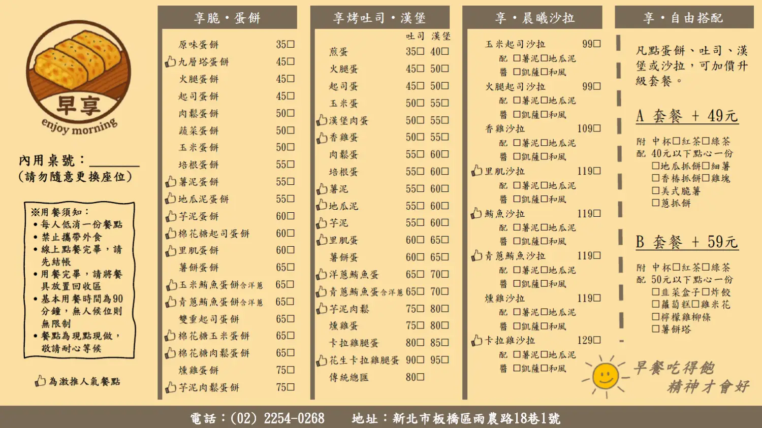 這次團子來到板橋臨近四維公園的「早享早午餐」用餐,店家以酥脆蛋餅聞名,還有漢堡、吐司、沙拉等料理,可單點也有套餐可選擇,價格多為親民銅板價,交通也很便利,從新埔國中、新埔國小走過來都不遠,是個適合悠閒吃早午餐的角落。